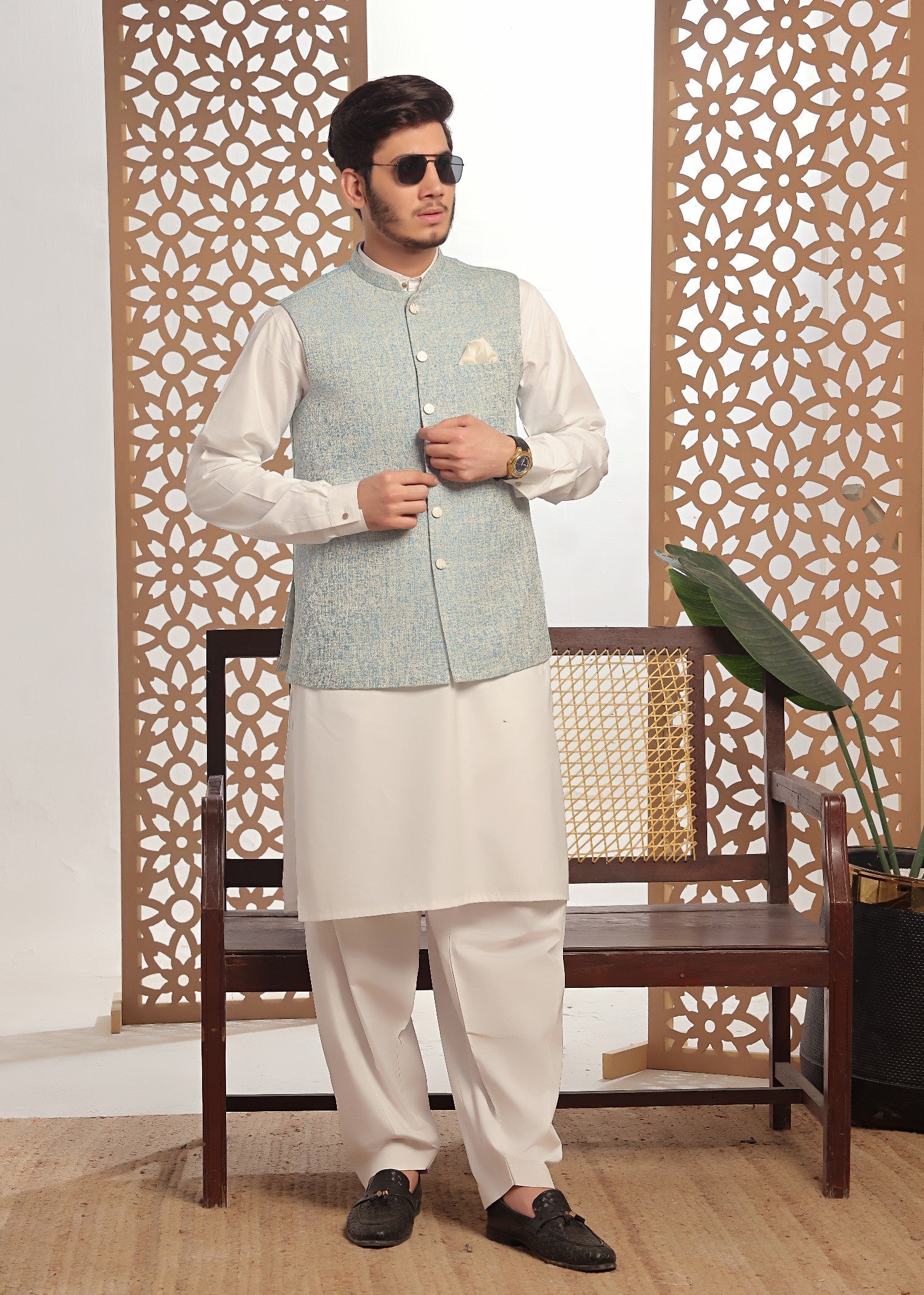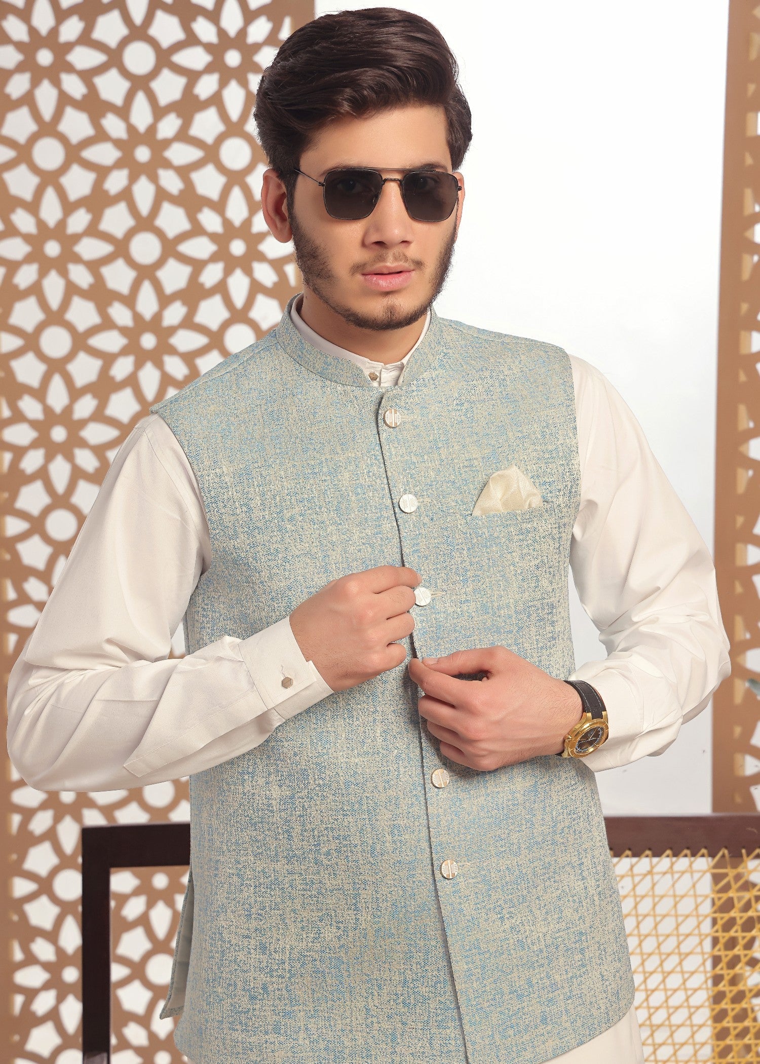 Gender:Â Menn Category:Â Clothingn Outfit Type:Â Easternn Sub-Category:Â Waistcoatn Color Type:Â Tealn Fabric:Â Wash & Wearn Number of Pieces:Â 3 Piece – Top + Bottom + Outerwearn