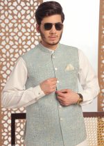 Gender:Â Menn Category:Â Clothingn Outfit Type:Â Easternn Sub-Category:Â Waistcoatn Color Type:Â Creamn Fabric:Â Raw Silkn Number of Pieces:Â 1 Piece – Outerwearn Product Type:Â Festive/Party Wearn Season:Â All Seasonn