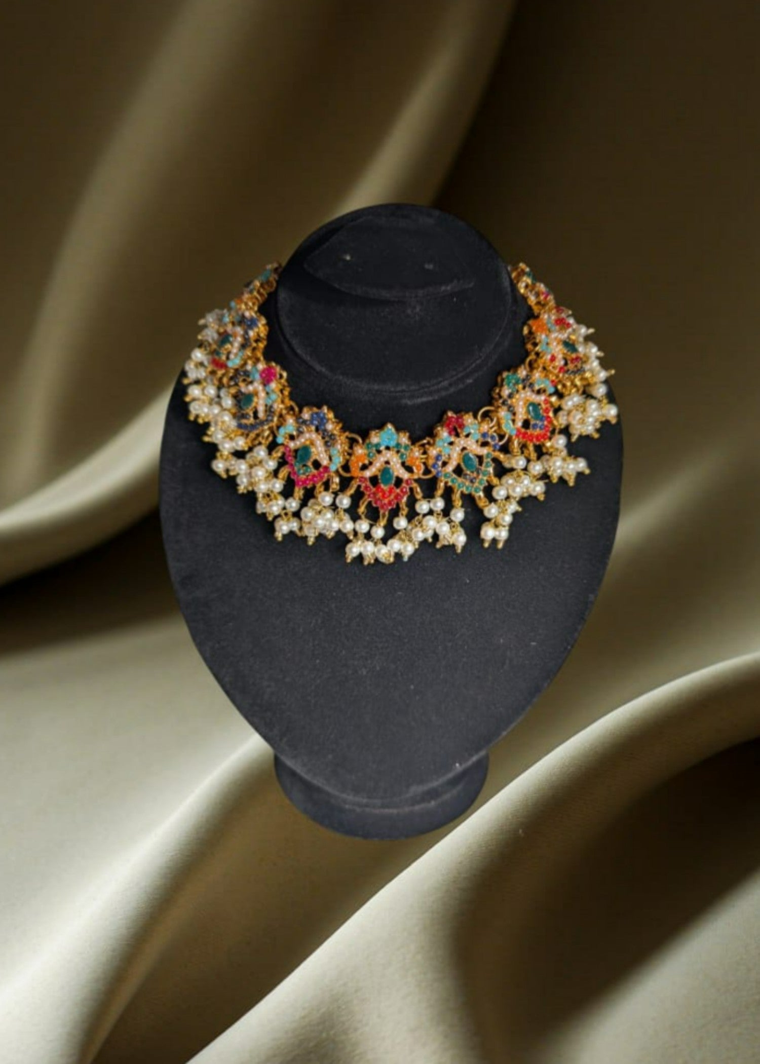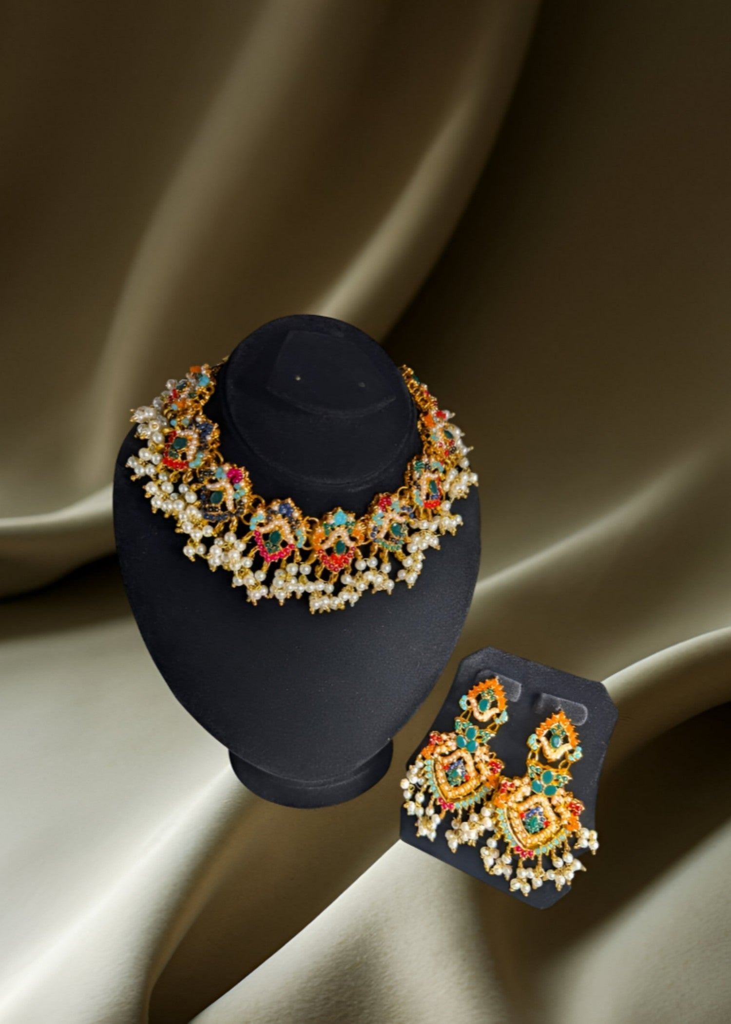 Additional Description:Â This exquisite bridal set features a statement necklace, matching earrings, and an elaborate jhoomar (side passa), all intricately designed with vibrant multi-colored Kundan stones and delicate pearl drops.n