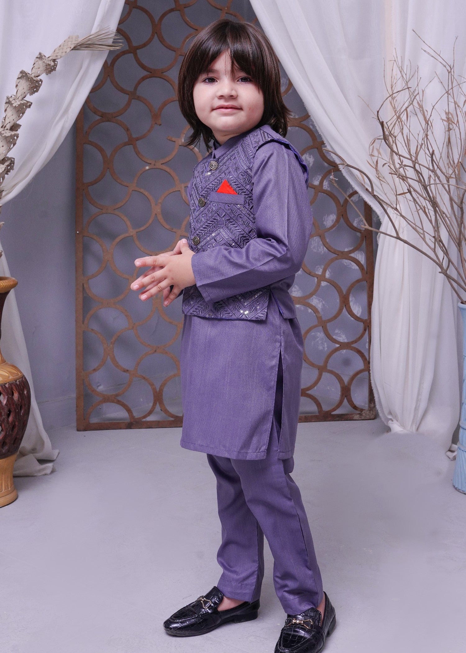 Additional Description:Â Waistcoat SuitnElevate your formal style with our elegant waistcoat suit. Crafted from high-quality [fabric], this three-piece ensemble includes:n- Color: Plum Purplen- Fabric: blended embroidered waistcoat and soft wash and wear shalwar kameezn- Size: 2-3 yrs to 12-13 yrs n- Style: FormalnnExperience the perfect blend of style, comfort, and sophistication with our waistcoat suit.n