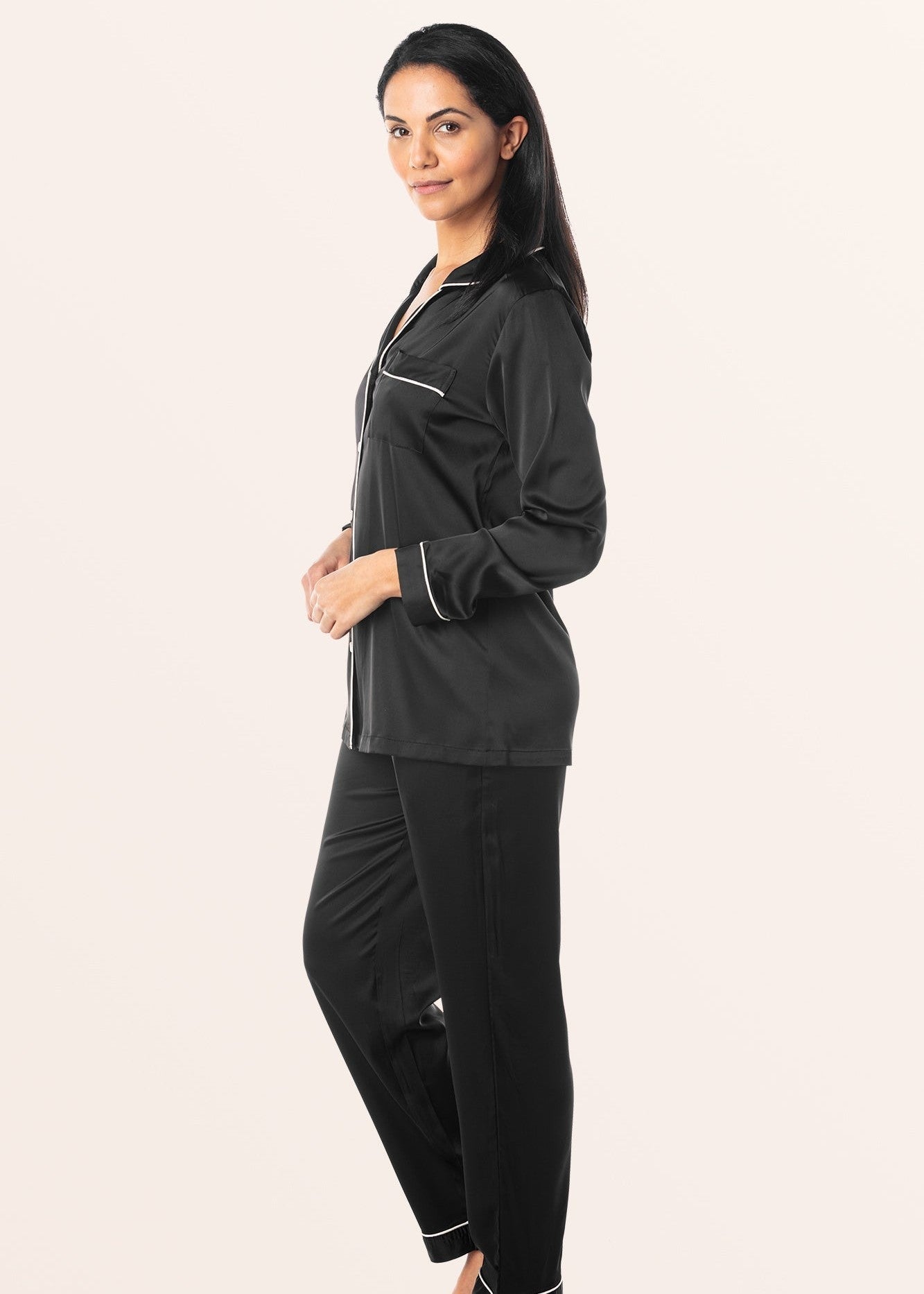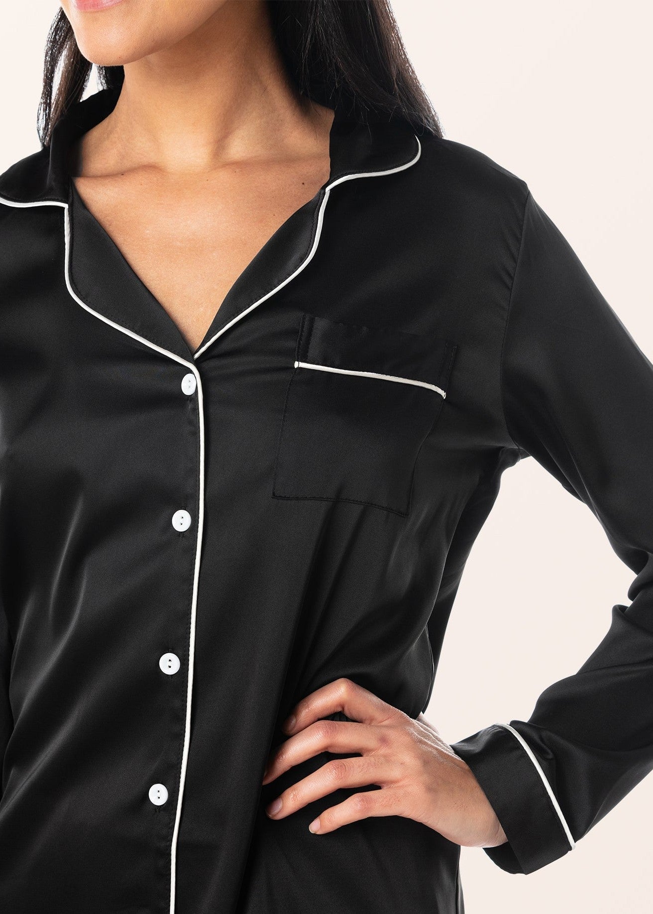 Additional Description:Â Description:nnThe Sajiero Silk Pajama Suit – Pearl is a comfortable and stylish pajama set made from soft satin silk. It includes a button-down shirt, matching pajama pants, and a scrunchie. Perfect for relaxing evenings, this set adds a touch of elegance to your sleepwear.nnFeatures:nnMaterial: Made from soft satin silk for a smooth feel.nComplete Set: Comes with a button-down shirt, pajama pants, and a matching scrunchie.nElegant Design: The pearlized silk gives a sophisticated look.nComfortable: Light and breathable fabric for a comfortable sleep.nFabric Care: Hand wash only, avoid bleach and harsh chemicals. Keep away from direct sunlight. Use a low heat setting for drying.n